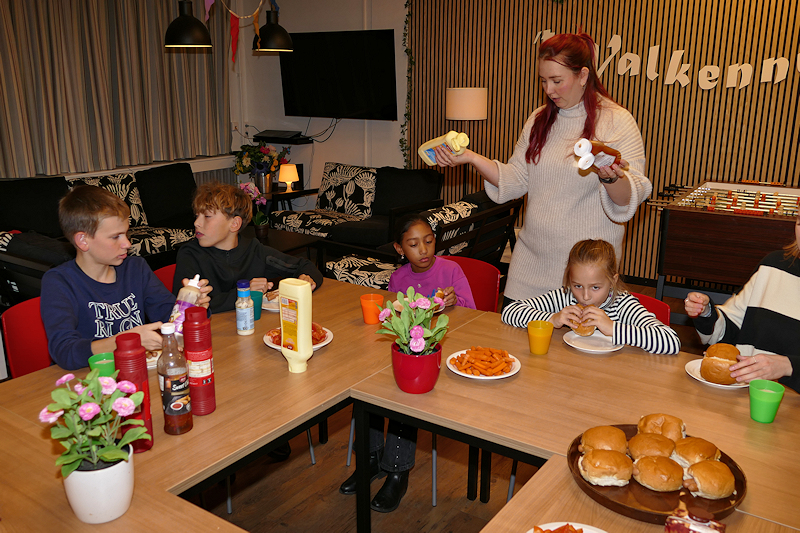 De KidsTime-midag op woensdag 29 oktober begon met het zoeken naar herfstblaadjes en eikeldopjes in het bos tegenover ’t Valkennest. Daarna gingen de kinderen met het verzamelde materiaal een schilderij maken. Daar zaten mooie creaties bij. Ondertussen maakte de leiding heerlijke broodjes worst klaar. Die na het knutselen gretig aftrek vonden onder de aanwezigen. Als toetje was er vlaflip. Hoewel het buiten koud, nat en donker was, was het binnen warm en gezellig.
